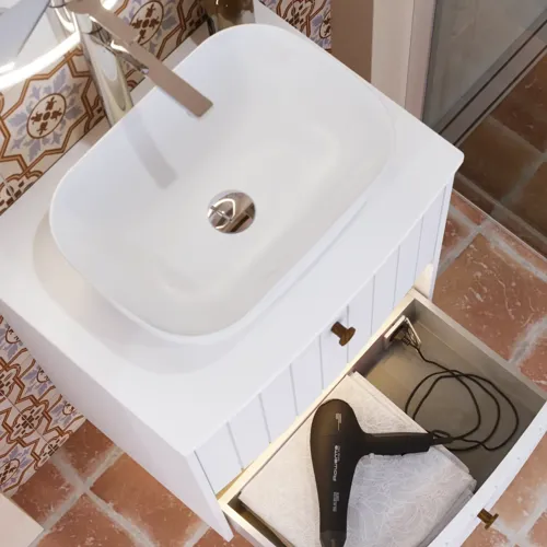 Weiße Oberflächen reflektieren das Licht und haben fast magische Fähigkeiten, den Raum größer und luftiger wirken zu lassen. Eine weiße Tischplatte ist daher ideal für kleine und große Badezimmer – sie bringt Ruhe, Balance und Offenheit. In der Calidris-Serie kannst du einen besonders minimalistischen Look mit einer dünnen weißen Solid Surface-Tischplatte erzielen, die elegant über dem Waschtischunterschrank schwebt. In der Luna-Serie ergibt die Kombination aus weiß matter Laminat-Tischplatte und passendem Keramikwaschbecken einen stilvollen, aber wohnlichen Ausdruck. Unabhängig vom Material hebt die weiße Farbe die Details des Raums – Fliesen, Armaturen oder Schränke – hervor und schafft ein harmonisches Zusammenspiel von Licht und Materialien. Dank der Möglichkeit von Sondermaßen wird die Tischplatte exakt an deinen Raum angepasst und unterstützt eine architektonisch klare Linienführung. So zeigt sich der weiße Look von seiner besten Seite – funktional und poetisch zugleich.